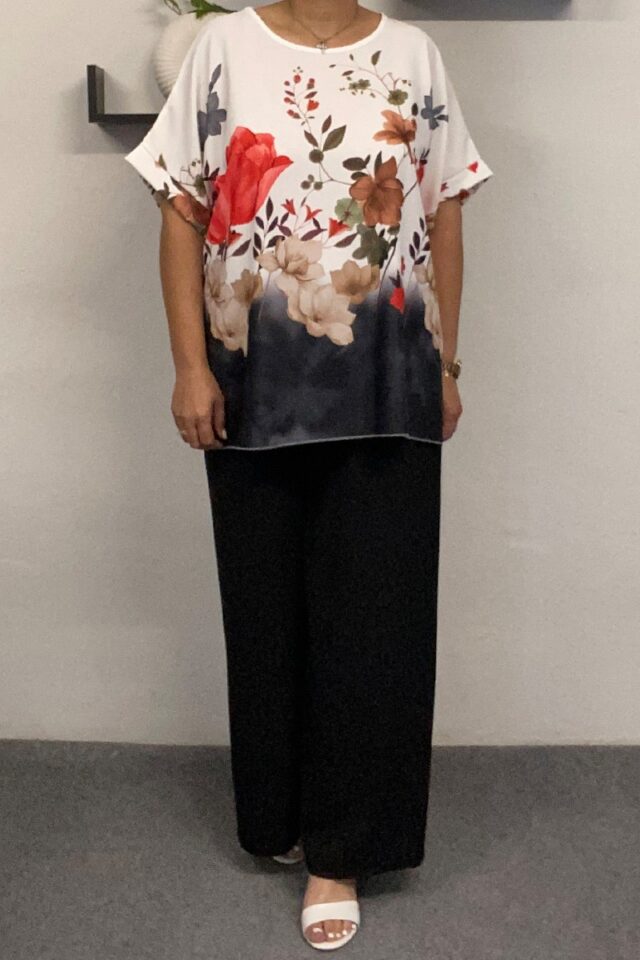 Η φλοράλ μπλούζα, με το αέρινο ύφασμά της και το ρομαντικό μοτίβο, αποτελεί το επίκεντρο του σετ. Η παντελόνα που συνοδεύει τη μπλούζα είναι το ίδιο εντυπωσιακή: ψηλόμεση, με φαρδιά γραμμή και ελαστική μέση, χαρίζει άνεση στην κίνηση και μία φινετσάτη σιλουέτα. Το ύφασμα είναι μαλακό, δροσερό και ιδανικό για τους καλοκαιρινούς μήνες, ενώ το floral μοτίβο ολοκληρώνει το σετ με απόλυτη αρμονία.