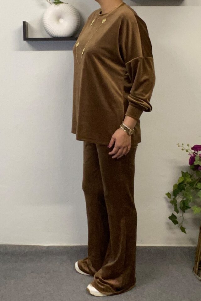 Καφέ βελούδινο γυναικείο σετ που αποτελείτε από μπλούζα και παντελόνι.