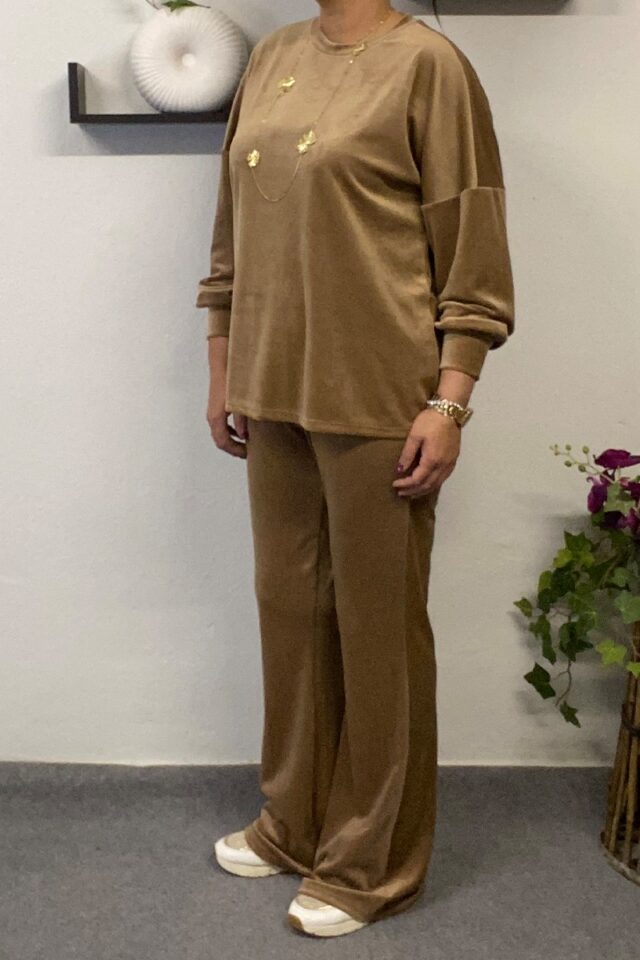 Ταμπά βελούδινο γυναικείο σετ που αποτελείτε από μπλούζα και παντελόνι. Η μπλούζα είναι σε ίσια γραμμή με μανίκια που πέφτουν στους ώμους και μανσέτα στο τελείωμα. Το παντελόνι έχει λάστιχο στην μέση για άψογη εφαρμογή και μια ελαφριά καμπάνα στις άκρες.