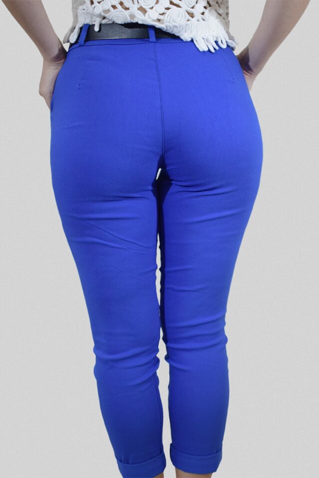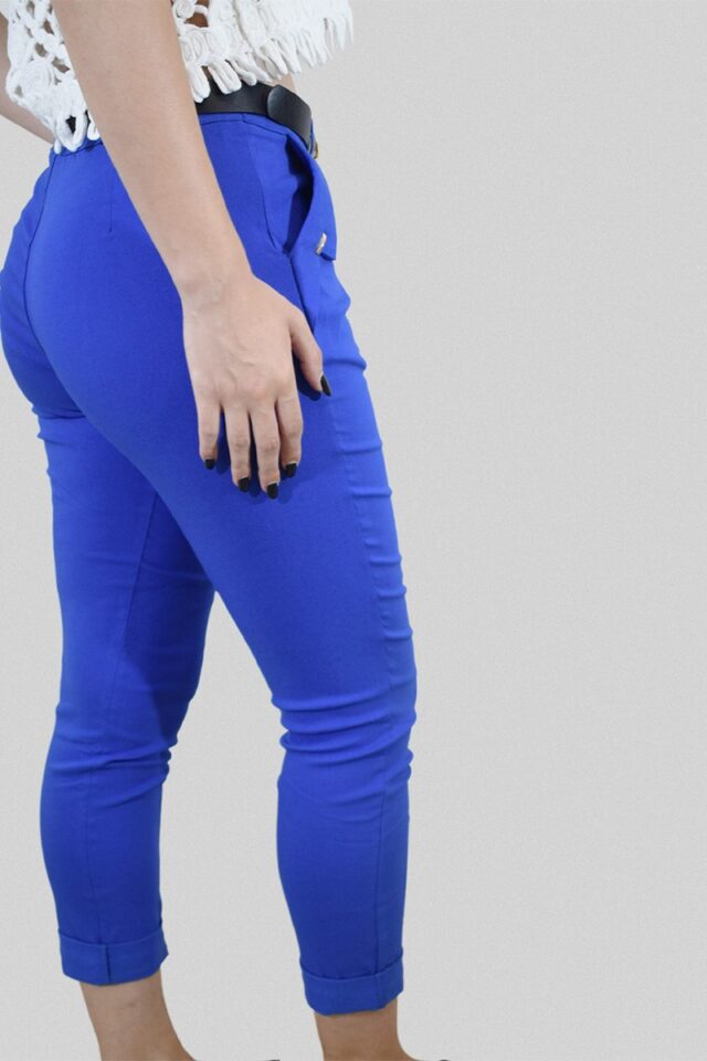 Ελαστικό παντελόνι μπλε-ρουά με άψογη εφαρμογή. Έχει δύο πλαϊνές τσέπες με ραμμένη φάσα που δημιουργεί σχέδιο και κλείνει με κουμπί και φερμουάρ. Διαθέτει μαύρη αποσπώμενη ζώνη. Ένα υπέροχο παντελόνι που μπορείτε να συνδυάσετε εύκολα με όλα τα στυλ όπως casual αλλά και chic εμφανίσεις.. Θα το βρείτε s έως xxl.