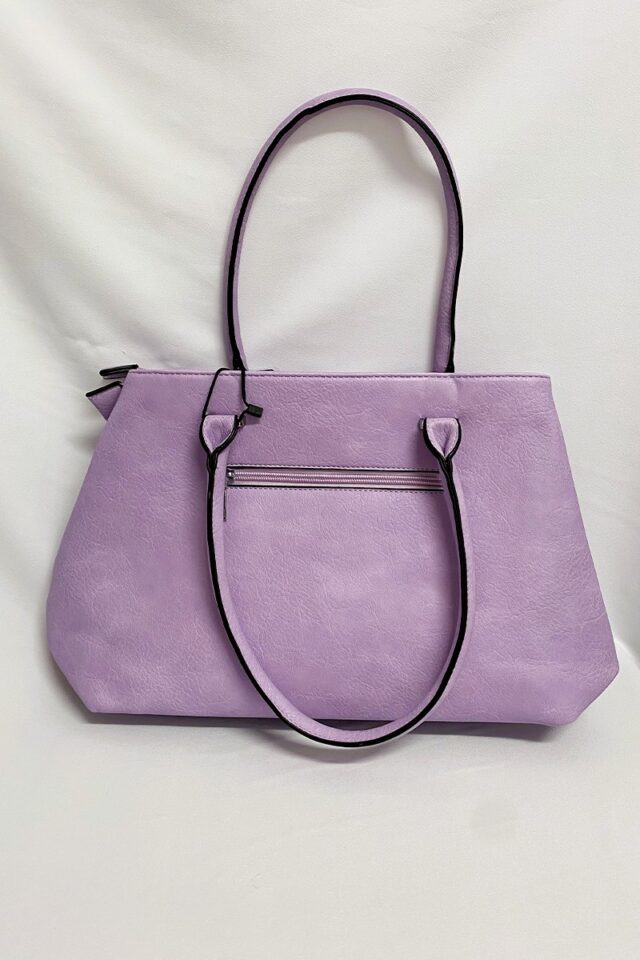 Γυναικεία τσάντα λιλά από εξαιρετικής ποιότητας δερματίνη. Διαθέτει δύο κυρίως χώρους και ασφαλίζει με φερμουάρ. Στην πίσω πλευρά της τσάντας, εξωτερικά, υπάρχει θήκη, η οποία επίσης κλείνει με φερμουάρ.