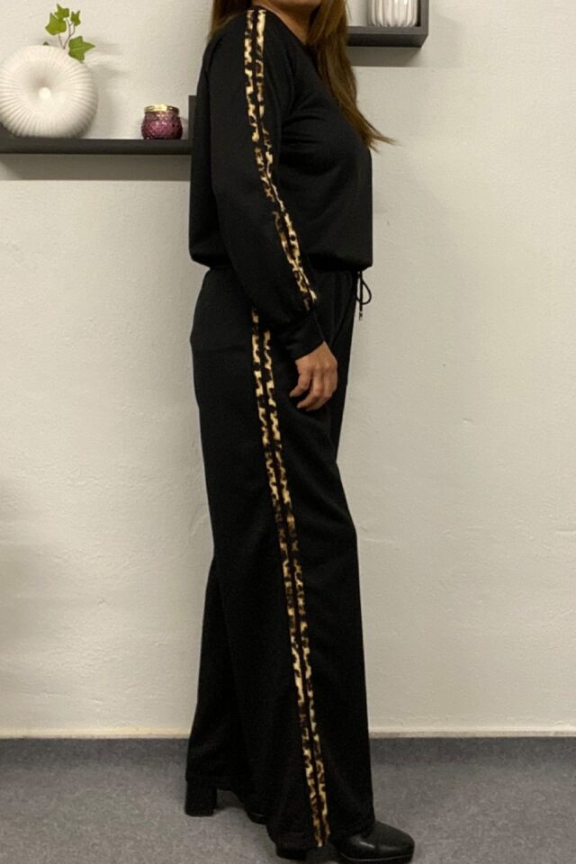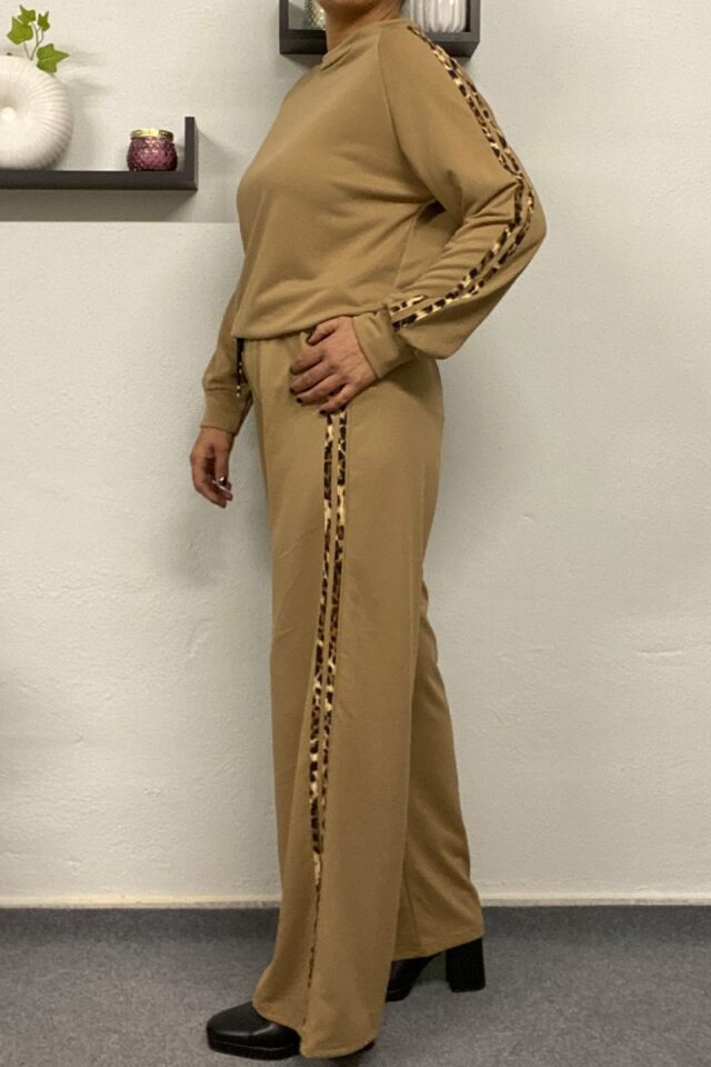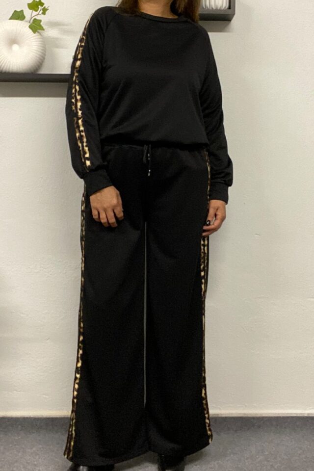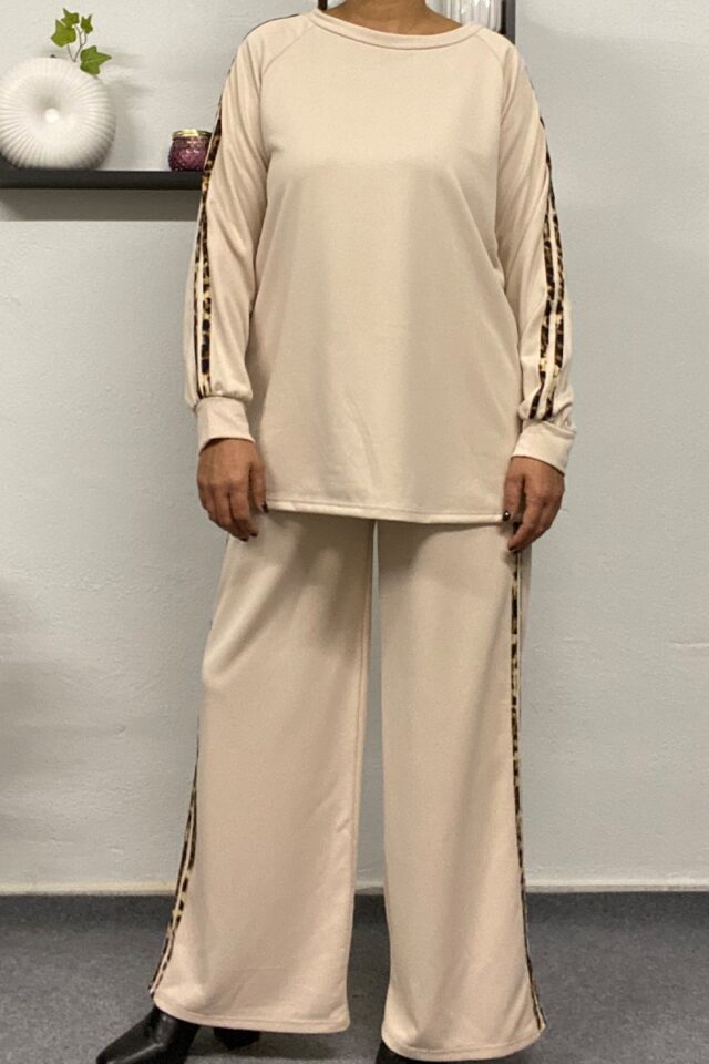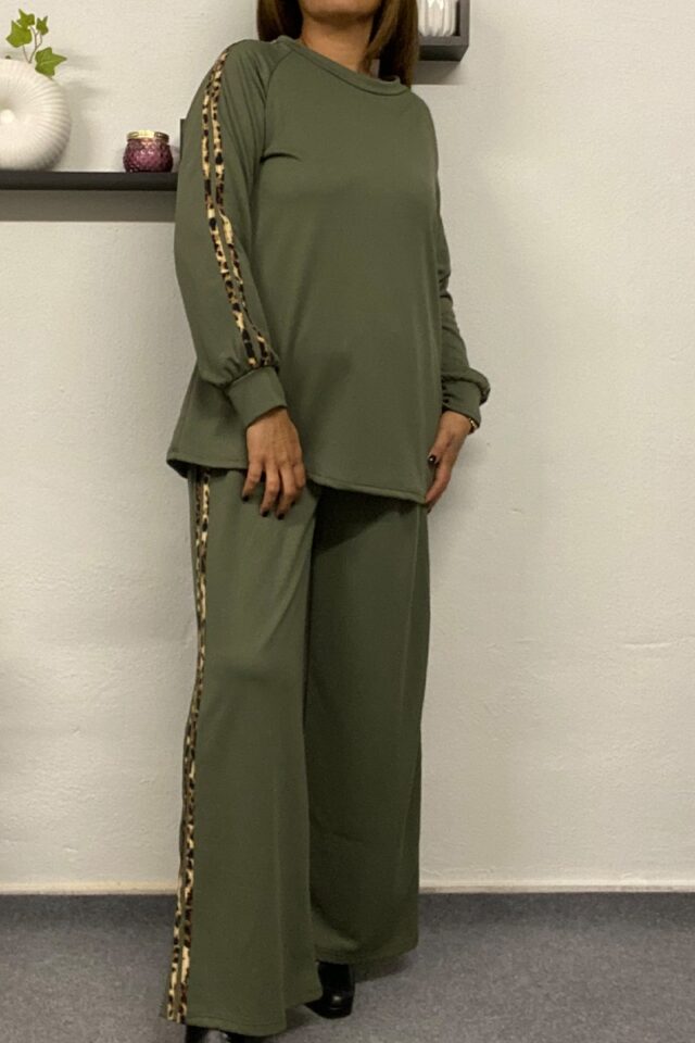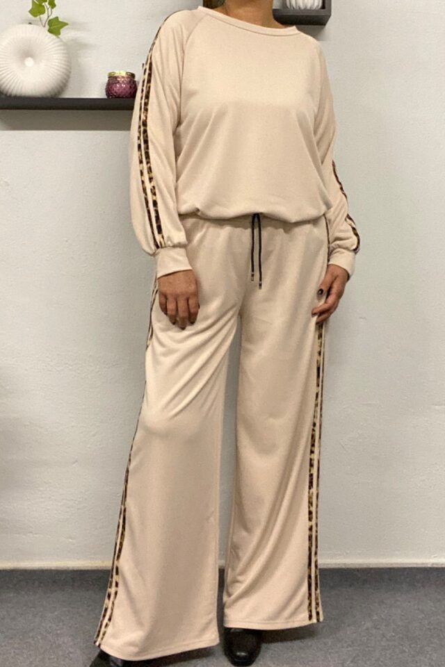 Γυναικείο σετ με ρίγα animal print. Το σετ αποτελείτε από μπλούζα και παντελόνι. Η μπλούζα είναι σε ίσια γραμμή με λαιμόκοψη χαμόγελο. Τα μανίκια διαθέτουν μανσέτα για τέλεια εφαρμογή στο ύψος που επιθυμείτε. Το παντελόνι έχει επίσης ίσια γραμμή με λάστιχο στην μέση αλλά και κορδόνι για να το σφίξετε όσο θέλετε. Είναι one size και καλύπτει έως: