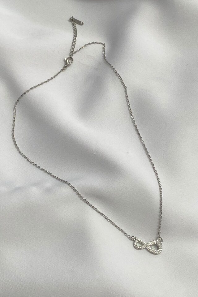 Κολιέ άπειρο σε ασημί χρώμα από ανοξείδωτο ατσάλι. Ένα κομψό κόσμημα που αλυσίδα του μπορεί να αυξομειωθεί στο μήκος που επιθυμείτε. Το σχήμα του απείρου έχει διάκοσμο από μικρά στρας ενώ στην κορυφή διαθέτει ένα μεγαλύτερο που εξέχει. το συνολικό μήκος της αλυσίδας είναι 48εκ. και το μήκος του στοιχείου 2εκ.