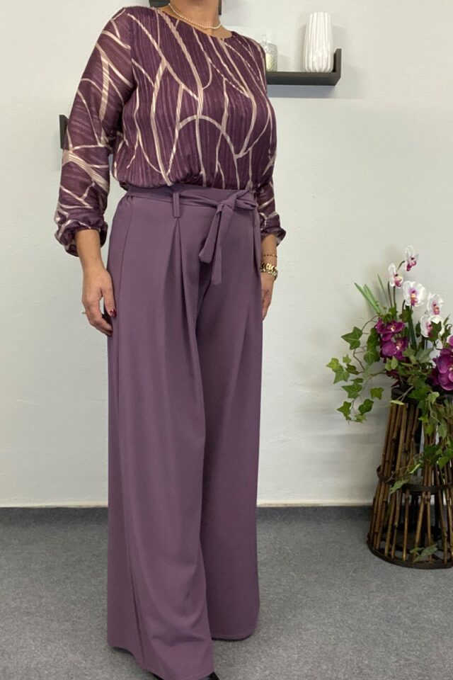 Παντελόνα μωβ με λάστιχο και φαρδιά ζώνη αποσπώμενη, από το ίδιο ύφασμα. Είναι σε ίσια γραμμή και μπροστά έχει δύο πιέτες που χαρίζουν υπέροχη κίνηση. Η τέλεια επιλογή για άνεση και στυλ.