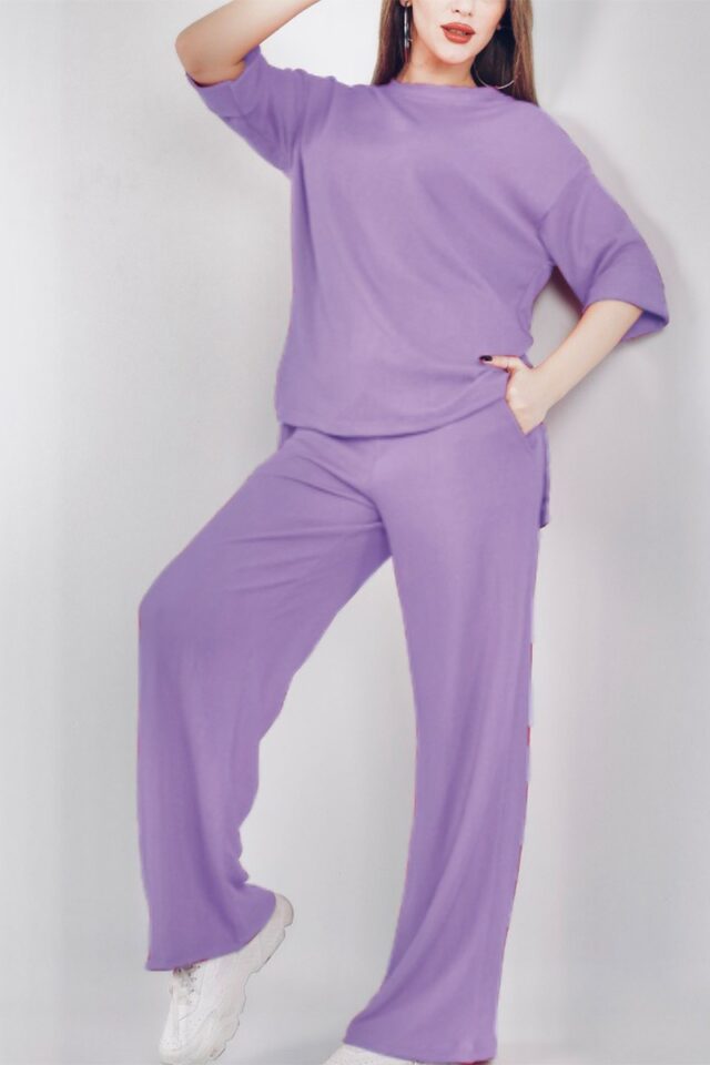 Σετ με ανάγλυφο σχέδιο στο ύφανση. Το σετ αποτελείτε από μπλούζα και παντελόνα. Η μπλούζα είναι σε ίσια γραμμή με άνοιγμα στο πλάι και ελαφρώς πιο μακριά στο πίσω μέρος. Έχει λαιμόκοψη χαμόγελο ενώ, τα μανίκια είναι 3/4 και στο τελείωμα διαθέτουν ρεβέρ. Η παντελόνα είναι επίσης σε ίσια γραμμή με λάστιχο στην μέση.