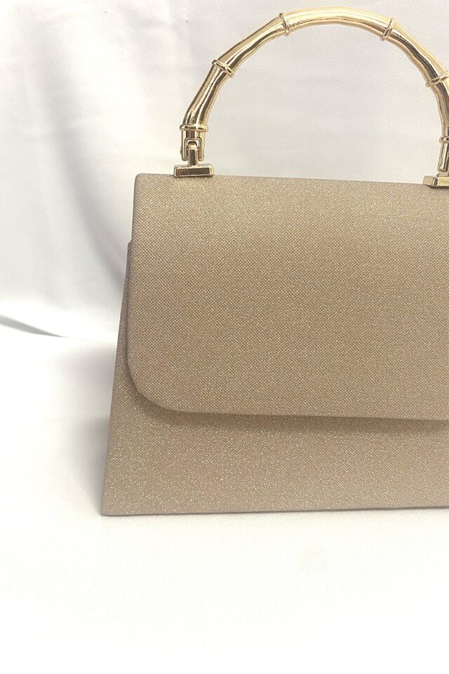 Τσάντα υφασμάτινη με glitter μπεζ-χρυσό και μεταλλικό χερούλι.
